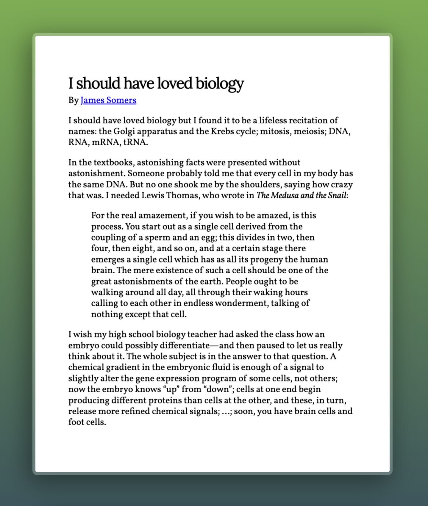 Welcome to a new issue of Words That Matter! This week, in lieu of a guest curator, we’re sharing ten pieces from Read Something Wonderful, a curation website/passion project made by the Matter team to showcase timeless internet writing. If you like this format, please ♥︎ the post so we know to do it again. And if something catches your eye but you don’t have time to read it now, save it to Matter. That’s what it’s for. :)