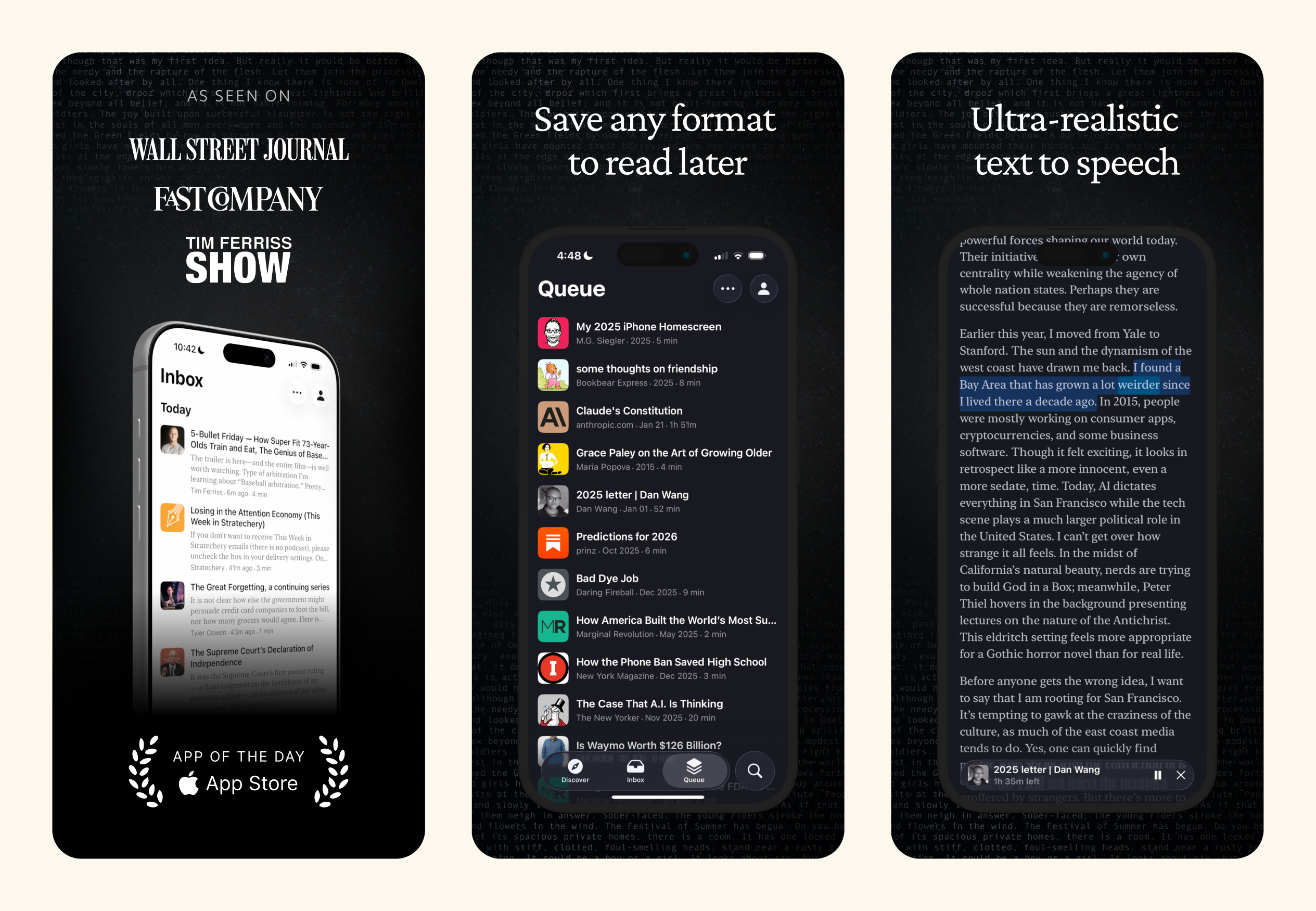 Designed for Apple, Matter has earned multiple App of the Day honors and won MacStories' 2025 Feature of the Year for its ultra-realistic text to speech, which now supports 15 languages. It's been recommended by Tim Ferriss, Patrick Collison, the Acquired Podcast, and The Wall Street Journal, among others.